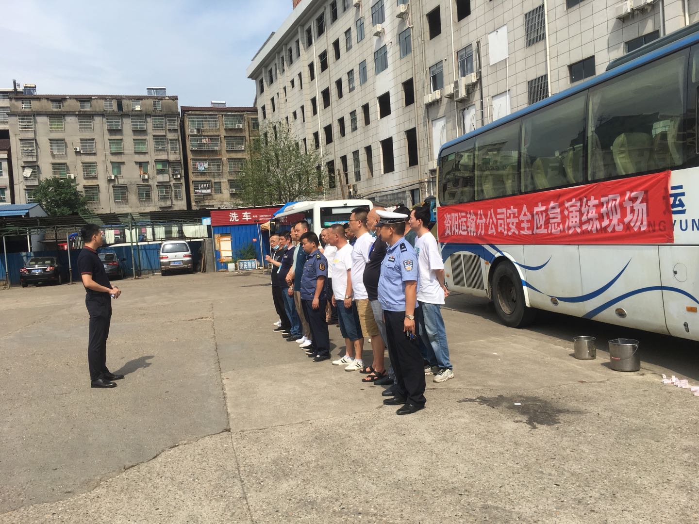 6月16日15點30分,資陽站務分公司聯(lián)合城區(qū)承包線、益銀巴士公司及資陽區(qū)交通局、資陽區(qū)道路運輸服務中心在車輛進站口下客區(qū)開展安全應急演練,共24人參加。在資陽區(qū)道路運輸中心主任楊與強調(diào)本次應急演練的注意事項及重要性后,宣布演練開始。