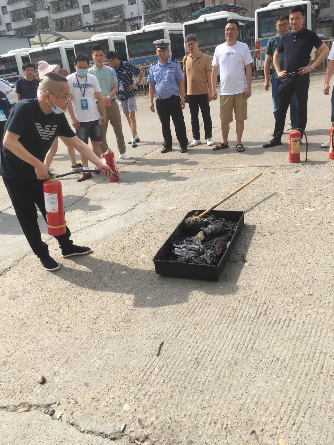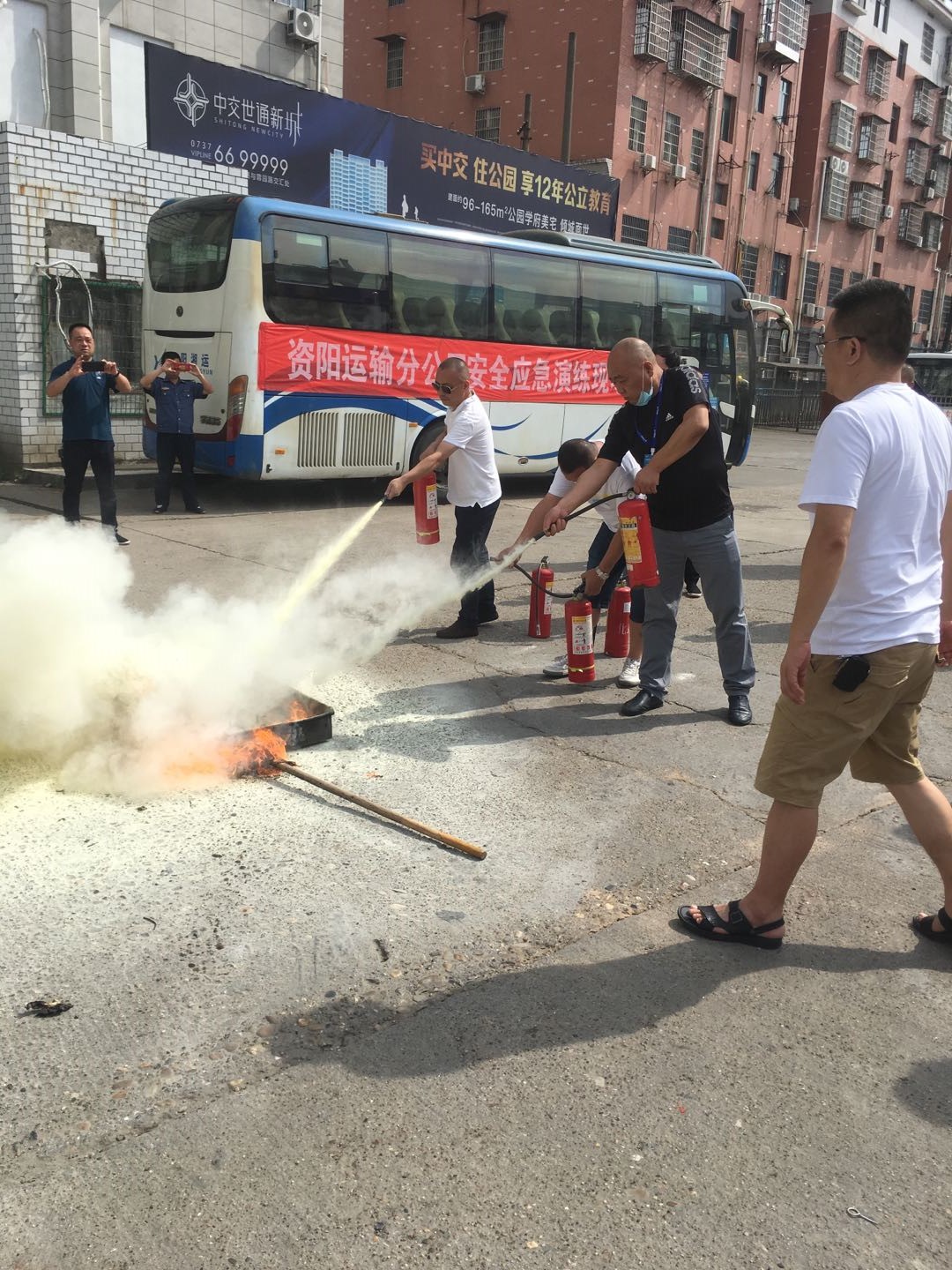 演練模擬長沙回益陽的車輛在下客區(qū)下客時,行李倉冒煙自燃,駕駛員第一時間撥打“119”報警并報告給應急演練領導小組,總指揮張軍、李益平在接到報告后第一時間趕到現(xiàn)場,指揮應急小組成員有效疏散旅客,隨后在交通、運管和119的大力協(xié)助下,旅客得以疏散逃生,大火得以撲滅。